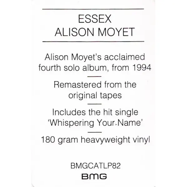 Essex is the fourth studio album by British singer-songwriter Alison Moyet. The album, named after the artist’s native Essex, England, was released in 1994, reached No. 24 in the U.K. and includes the singles „Falling,” „Whispering Your Name,” „Getting into Something” and „Ode to Boy.”