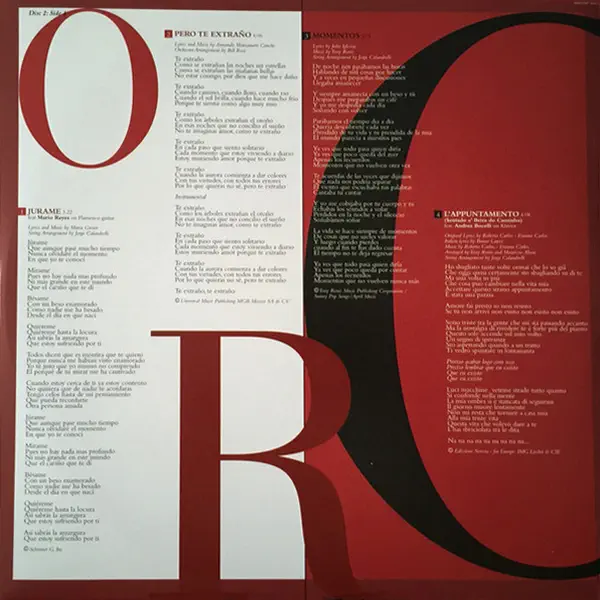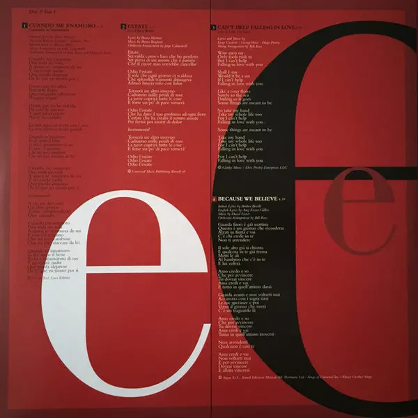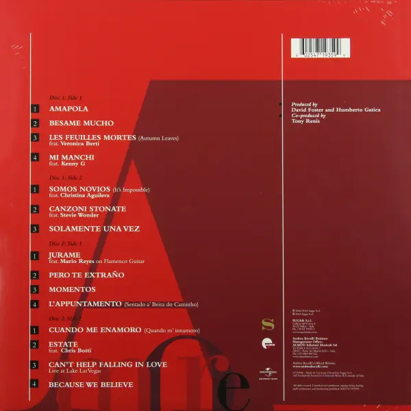 While creating the perfect track listing for Bocelli’s first-ever album of popular songs, Bocelli and his producers searched the musical eras from the 1920s to the 1980s for songs in Italian, Spanish, and French. Bocelli also added some of his favorite international pop songs. They are collected here and include special guests Stevie Wonder, Kenny G and Christina Aguilera. A 180g 2LP set in a gatefold package with printed inner sleeve.