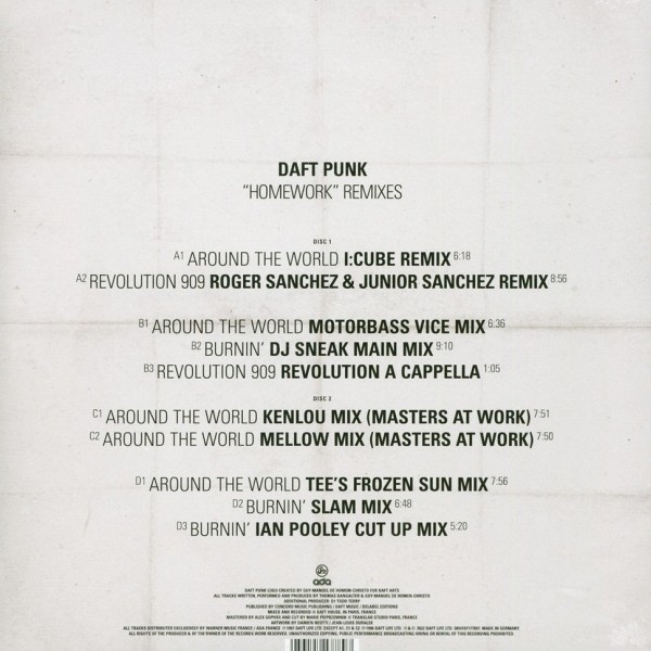 To continue the celebration of the 25th anniversary of their critically acclaimed Homework album, the Homework (Remixes) album contains a collection of 1997/’98 remixes from I:Cube, Roger Sanchez & Junior Sanchez, Motorbass, DJ Sneak, Masters at Work, Todd Terry, Slam, and Ian Pooley.