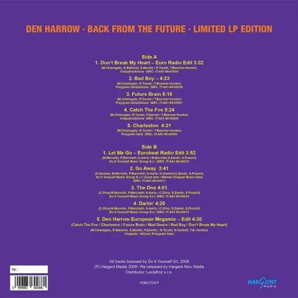 Back From The Future limited edition vinyl LP version. This particular release was released in Europe by Hargent Media in collaboration with Hargent New Media. The album spans the genres of Electronic Music, Italo-Disco and Euro House. Special Limited Edition 200 Copies Vinyl.