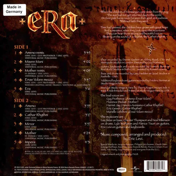 Decca Records France presents „ERA” for the first time on gold-coloured vinyl. Inspired by Carl Orff’s cantata Carmina Burana and released in 1996, Era’s first album immediately became a worldwide success, supported by the iconic track “Ameno”, having sold over 6 million copies and become the most exported French album at the time.