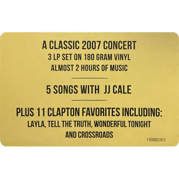 Recorded at Clapton’s March 15, 2007 performance at the iPayOne Center in San Diego, CA, this concert was part of a world tour that was much loved by Clapton fans and featured a stellar band that included guitarists Derek Trucks (now of the Tedeschi Trucks band) and Doyle Bramhall II. The two-hour San Diego concert was a highlight of the tour as it featured JJ Cale as a special guest on five tracks (including „After Midnight” and „Cocaine”), as well as Robert Cray on the final song of the record, „Crossroads”.