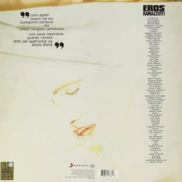 Ramazzotti had won the ‘New Voices’ category in the 1984 San Remo Music Festival with the song „Terra promessa”, which went on to peak at #2 on the Italian Singles Chart and is included here. At the 1985 San Remo Festival, Ramazzotti entered the main competition with „Una storia importante”, which placed sixth but subsequently topped the Italian chart and also reached # 2 in France. Cuori agitati made #10 on the Italian Albums chart.