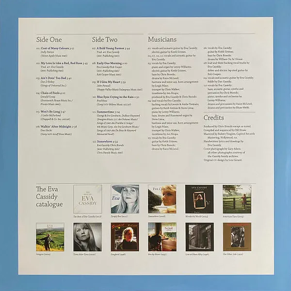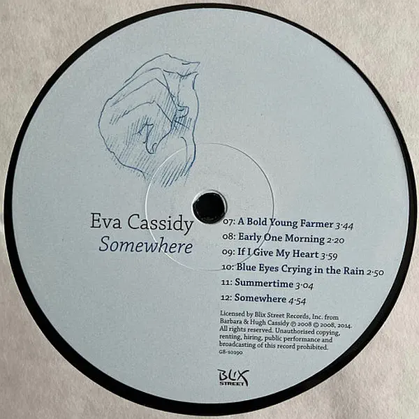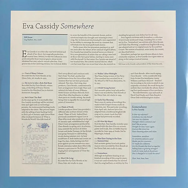 Vinilinė plokštelė „Somewhere“ – tai jautrus ir įvairiaspalvis legendinės amerikiečių atlikėjos Eva Cassidy kūrybos puslapis, dabar pirmą kartą išleistas vinilo formatu. 2014 m. Blix Street Records pristatytas perleidimas – 180 g svorio plokštelė, presuota Optimal Media gamykloje – suteikia galimybę šį ypatingą albumą patirti analoginiu skambesiu.