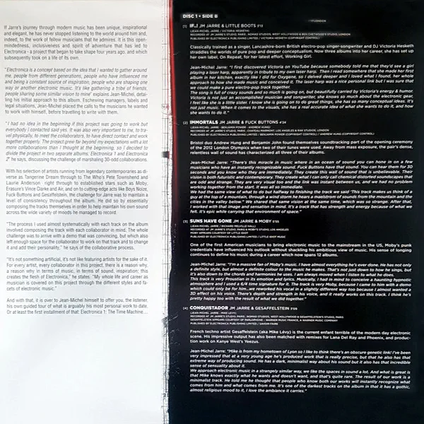 Be to, šiame projekte Jarre pirmą kartą dirba taip plačiai su kitais kūrėjais – kiekviena daina yra bendras kūrybinis eksperimentas, kuriame susiduria skirtingos patirtys, garsiniai pasauliai ir idėjos. Pavyzdžiui, kartu su Boys Noize sukurtas titulinis kūrinys „The Time Machine“ pulsuoja jėga ir klubine energija, tuo tarpu bendradarbiavimas su M83 „Glory“ užburia nostalgiška, sintezinėmis spalvomis alsuojančia atmosfera. Dar daugiau – AIR dueto prisilietimas kuriant „Close Your Eyes“ suteikia kompozicijai šilumos, organiško analogo ir prancūziško elektronikos subtilumo.