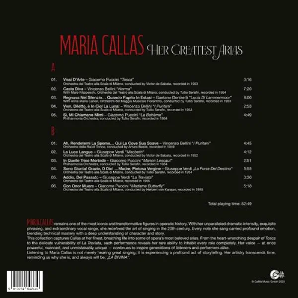 Be to, šis leidimas pasižymi išskirtine garso kokybe, todėl klausytojas gali pasinerti į tokias legendines interpretacijas kaip „Vissi D’Arte“ iš Tosca ar „Addio, del Passato“ iš La Traviata. Kiekvienas kūrinys perteikia Callas unikalų gebėjimą derinti subtilią emociją su stulbinančia vokaline galia.