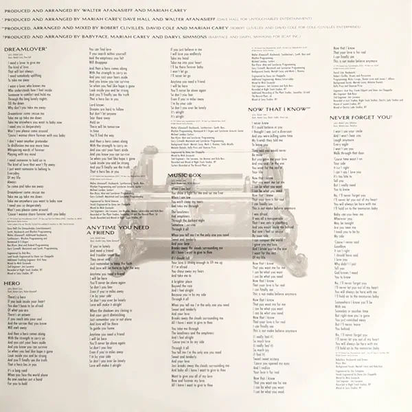 Be abejo, ypatingą vietą užima ir „Without You“ – emocionali klasikinio kūrinio interpretacija, kurioje Mariah vokalas skamba nepaprastai dramatiškai ir jautriai. Be to, tokios dainos kaip „Anytime You Need A Friend“ ar titulinė „Music Box“ dar kartą patvirtina jos gebėjimą perteikti tiek techninį meistriškumą, tiek nuoširdžią emociją.
