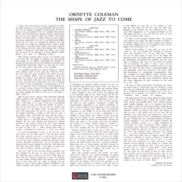 1959 metais pasirodęs The Shape Of Jazz To Come buvo trečiasis Ornette Coleman albumas, tačiau būtent jis laikomas tikrąja menininko proveržio viršūne. Nuo pat pirmųjų akordų šis įrašas liudijo radikalią kryptį, kurią Coleman pasirinko, siekdamas išlaisvinti džiazą iš griežtų struktūrinių rėmų. Nors tai buvo drąsus žingsnis, ilgainiui paaiškėjo, kad jis padarė neišmatuojamą įtaką visai žanro raidai.