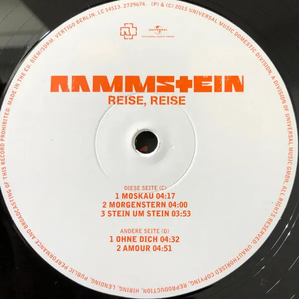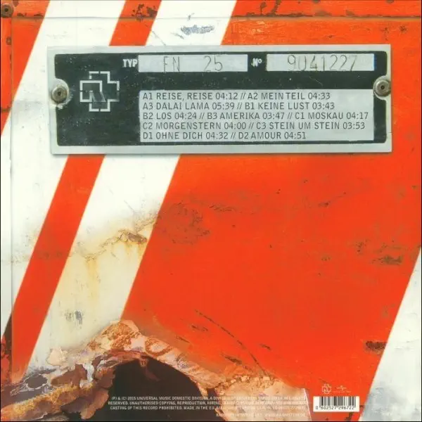 „Reise, Reise” is the fourth album by Rammstein. It was recorded at El Cortijo Studio in Málaga and was originally released on September 27, 2004. As singles, the band released the songs „Mein Teil” (2004), „Amerika” (2004), „Ohne dich” (2004) and „Keine Lust” (2005).