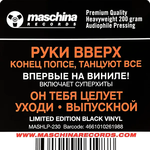 Vinilinė plokštelė Руки Вверх! „Конец попсе, танцуют все!“ – tai 2002 metais išleistas septintasis studijinis grupės albumas, kuris žymi svarbų kūrybinį lūžį jų karjeroje. Nors iki tol kolektyvas buvo siejamas su lengvu, šokių aikštelėms skirtu pop skambesiu, šiame albume jie sąmoningai siekia brandesnio ir emocingesnio pop muzikos skambesio. Todėl čia atsiranda daugiau lyrikos, gilesnių temų ir solidesnė aranžuočių struktūra.