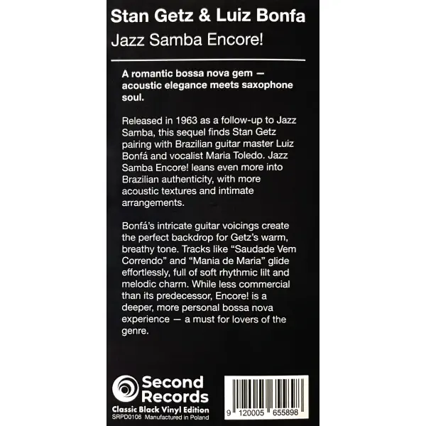 „Jazz Samba Encore!“ – tai subtilus ir romantiškas bossa nova perlas, kuriame akustinė elegancija susilieja su šiltu, sielą paliečiančiu saksofono skambesiu. Išleistas 1963 metais kaip itin sėkmingo albumo „Jazz Samba“ tęsinys, šis darbas atskleidžia dar gilesnį Stan Getz susižavėjimą braziliškąja muzika ir jos autentika.