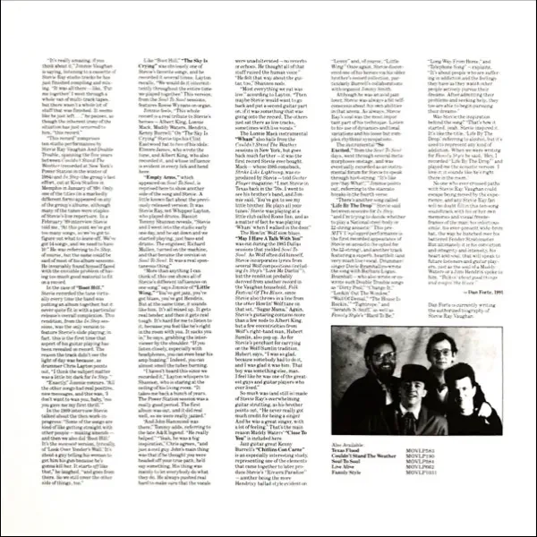The Sky Is Crying was released after SRV’s 1990 helicopter crash that took his life. The posthumously assembled 10-track outtakes collection actually proves to be one of Vaughan’s most consistent albums, rivaling In Step as the best outside of the Greatest Hits collection. These songs were recorded in sessions spanning from 1984’s Couldn’t Stand The Weather to 1989’s In Step and were left off of the LPs for whatever reason (or, in the case of Soul To Soul’s „Empty Arms”, a different version was used).