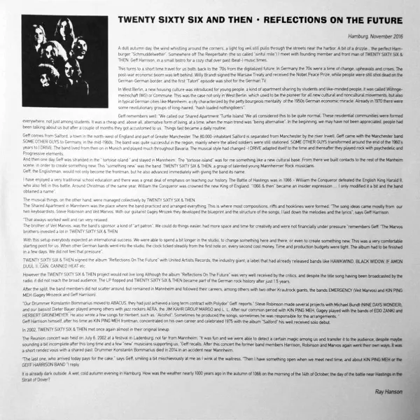 In a short way: the rediscovery of a Krautrock origin from the ‘Mannheim’-rock scene in the early 70ties. Twenty Sixty Six And Then were the singer Geff Harrison (the only member from the UK), Veit Marvos on organ, Steve Robinson played the second organ, Gagey Mrozeck guitar, Dieter Bauer on bass and Konstantin Heinrich Bommarius on drums.