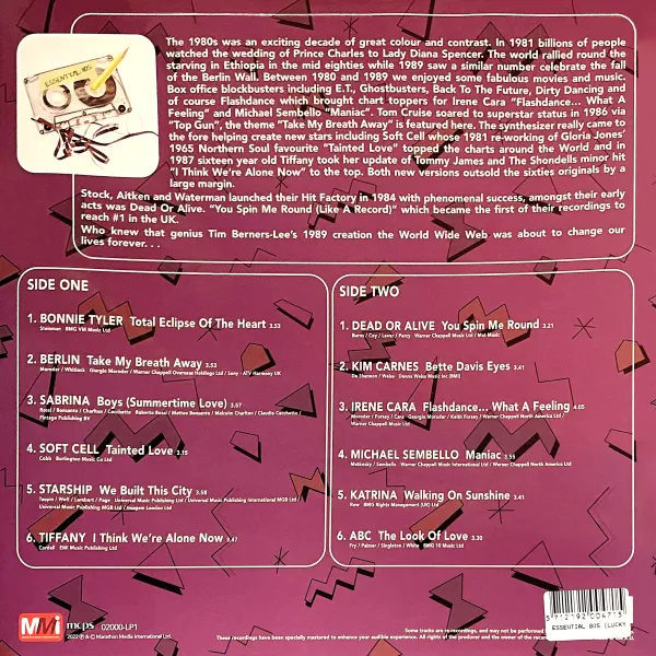 „Essential 80s“ – tai ryškiaspalvis kelionės bilietas į populiariosios muzikos aukso amžių, kuriame susipina nostalgiškos melodijos, didžiulė emocinė energija ir nepamirštamas aštuoniasdešimtųjų skambesys. Ši 2025 m. Marathon Media išleista vinilinė plokštelė yra kompiliacija, kruopščiai sudėliota taip, kad kiekvienas takelis primintų skirtingą šio dešimtmečio muzikos veidą. Be to, ši laida pasirodo Lucky Dip Eco Marble Vinyl – ekologiško, atsitiktinės marmurinės spalvos vinilo formatu, todėl kiekvienas egzempliorius pasižymi unikaliu, ekologišku marmuro raštu ir tampa išskirtiniu kolekcionuojamu objektu.