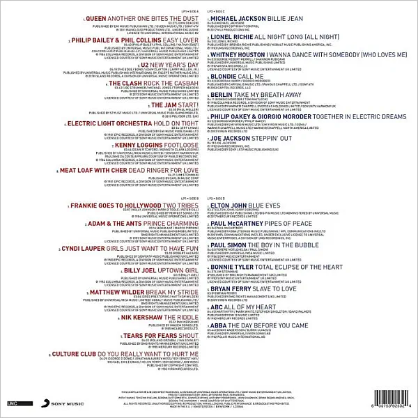 Side One features smashes from Queen with ‘Another One Bites The Dust’, Philip Bailey & Phil Collins ‘Easy Lover’ and Meat Loaf duetting with Cher on ‘Dead Ringer For Love’ alongside New-Wave hits from The Clash ‘Rock The Casbah’, The Jam ‘Start’, U2 with the amazing ‘New Year’s Day’ and pop-rock radio staples from Electric Light Orchestra ‘Hold On Tight’ and Kenny Loggins’ theme from ‘Footloose’.
