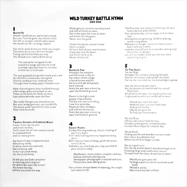 Vinilinė plokštelė Wild Turkey „Battle Hymn“ (Reissue Unofficial) (LP) – tai svarbus ankstyvojo britų progresyvaus ir hard roko dokumentas, nukeliantis į laikus, kai roko muzika drąsiai eksperimentavo su formomis, nuotaikomis ir instrumentuotėmis. Šis albumas pirmą kartą pasirodė 1971 metais ir tapo debiutiniu grupės darbu, tačiau jo reikšmė gerokai viršija „pirmojo įrašo“ statusą.